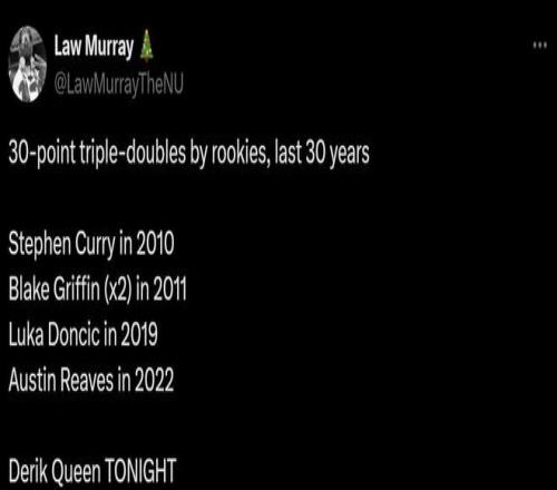 本场也是奎因其生涯首次拿到三双,成为25届第一位拿到三双的新秀,鹈鹕队史第三名拿到三双的新秀,更是成为NBA历史上首位拿下30+三双的新秀中锋。